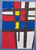 These students looked at Piet Mondrian and we talked about primary colors in class. The students were very careful to paint within their borders and worked on mastering their glue skills.